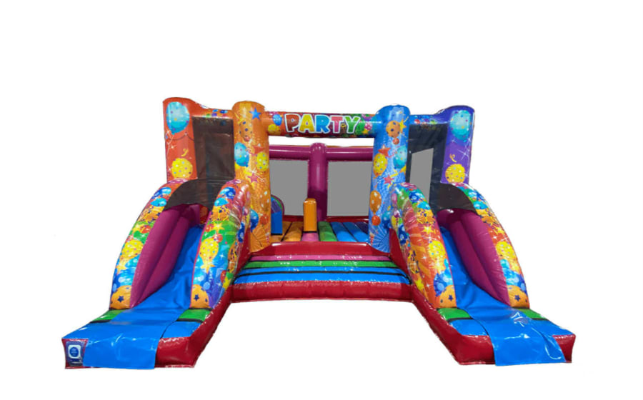 Get ready for double the fun with our Large Double Slide Combo Bouncy Castle, featuring a bright and colourful balloon party theme that’s perfect for any celebration!