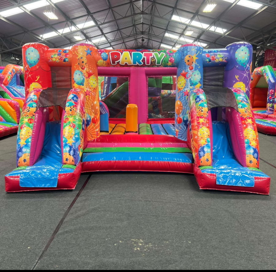 Get ready for double the fun with our Large Double Slide Combo Bouncy Castle, featuring a bright and colourful balloon party theme that’s perfect for any celebration!