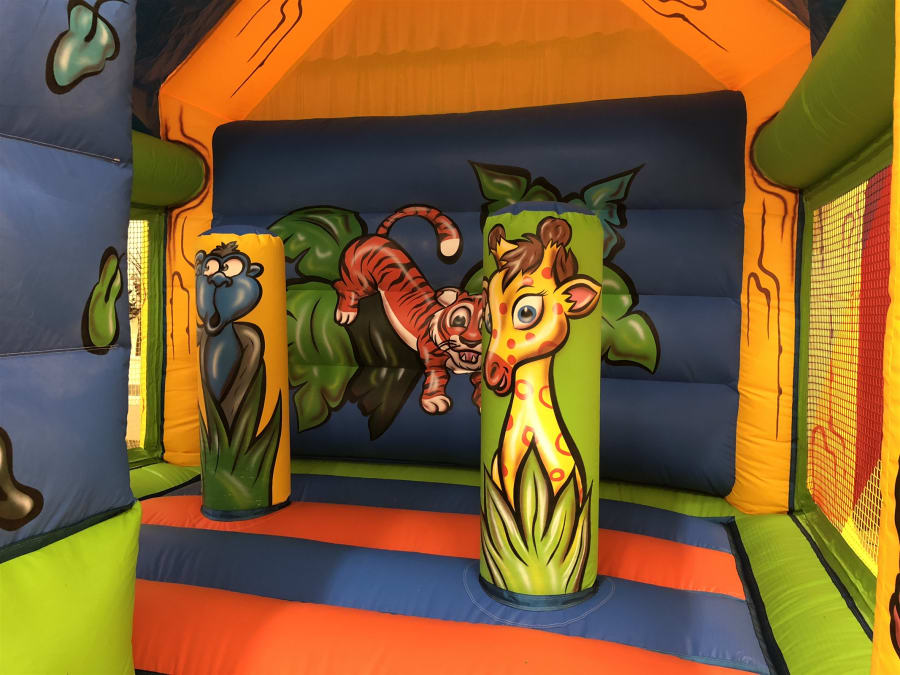 The jungle bounce and slide castle for hire is suitable for children only and can be used outside or indoors if you have the ceiling clearance. It has net sides so you can watch the fun, and a built-in shower cover to protect the little ones from rain or strong sunshine.