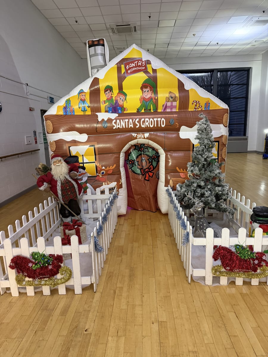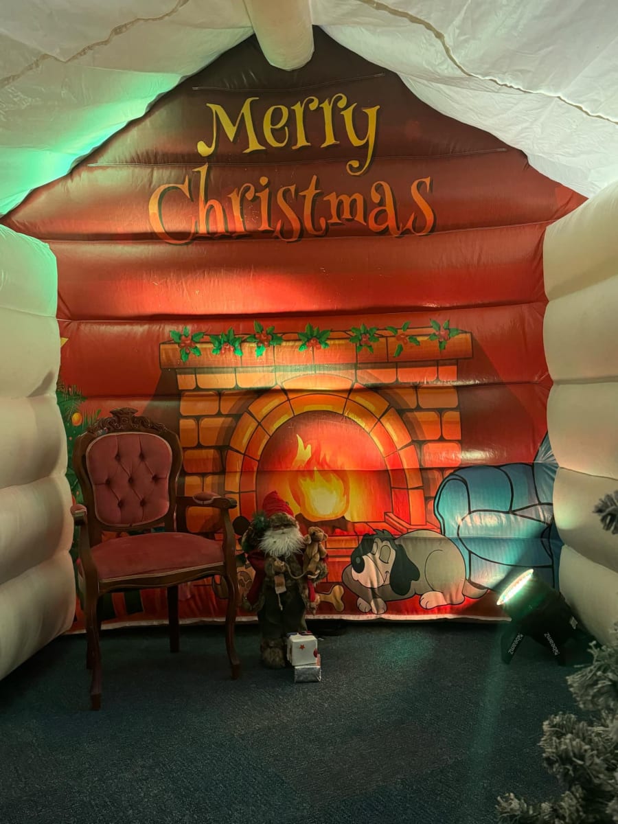 With beautiful artwork showing the elves hard at work making the presents, combined with the light up Christmas display, fake snow and white picket fences, children will love to look at this grotto as they wait in the queue to see the man himself. Once they get inside they will see the pictures of the roaring fire making it feel warm, cosy and very special whilst they meet Santa, who will be sat on his very own special chair, which is included in the hire.