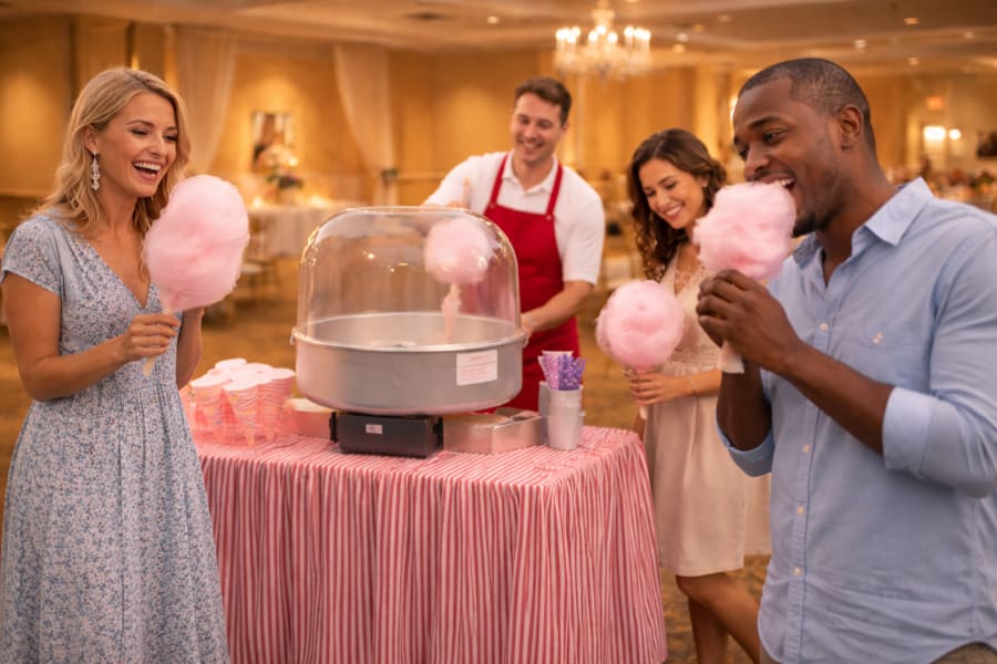 Candy floss adds a fun visual attraction and sweet treat for guests of all ages, making it a perfect addition to entertainment packages and party catering.