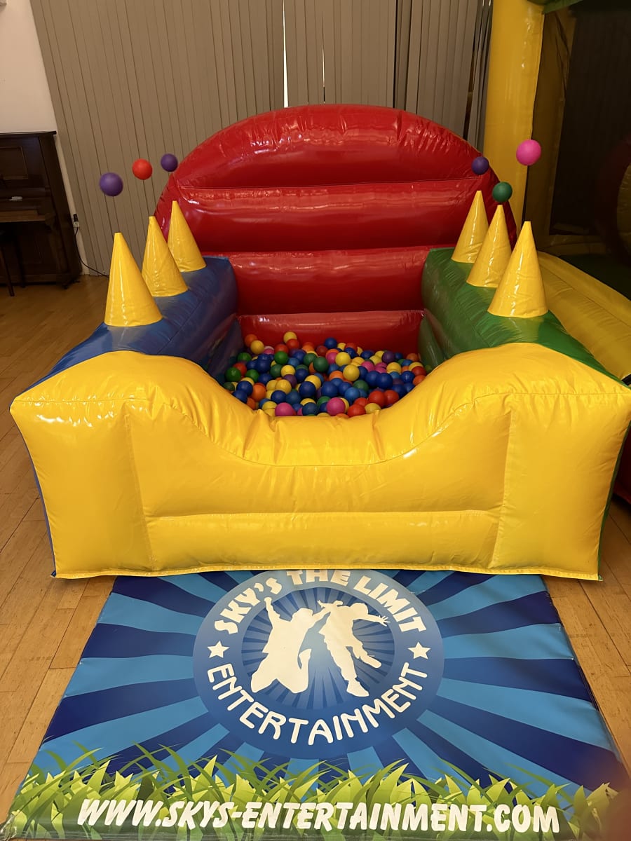 Our shiny large and bright ball pool, with air juggles on the right and left side is available to hire at your party or event. Toddler's and smaller children will love jumping into the sea of soft play balls.